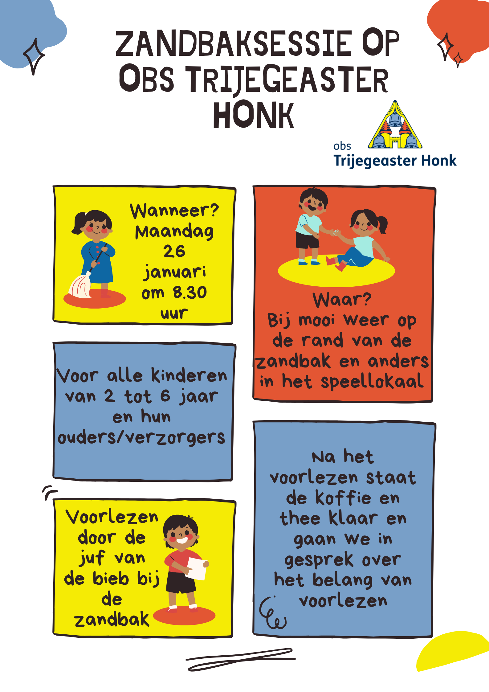 Op maandag 26 januari om 8.30 uur nodigen we alle kinderen van 2 tot 6 jaar samen met hun ouders/verzorgers uit op OBS Trijegeaster Honk.